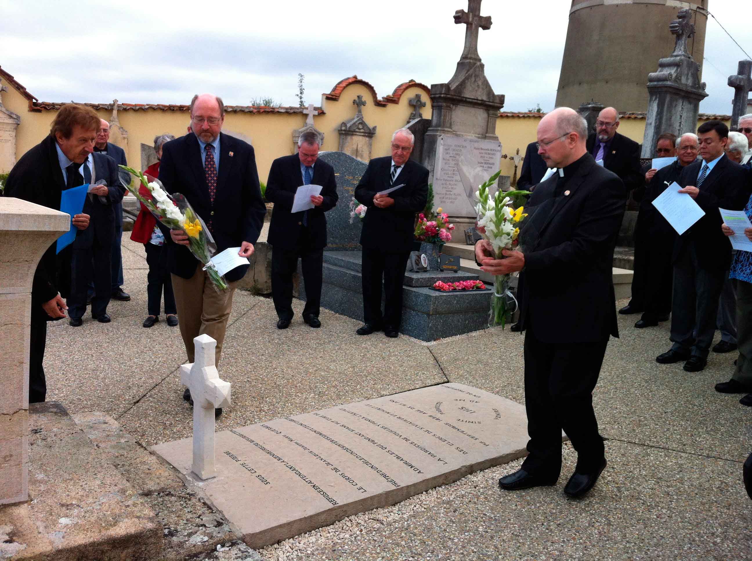 Los 50 ó 60 viatores llegados a Vourles nos arremolinamos alrededor de la tumba del Fundador. Un texto, no muy largo, nos hace reflexionar sobre la fe y la confianza en Dios del P. Luis. Unas plegarias recogen nuestra situación y la de la Iglesia. Y el gesto lleno de piedad filial: el Superior general saliente, Mark Francis, y el recién elegido, Alain Ambeault, posan dos hermosos ramos de flores sobre la lápida de la tumba. Todos nos uníamos en este gesto tan significativo y familiar.