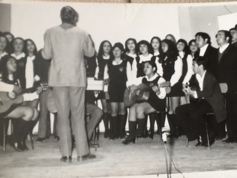 Aquí estoy dirigiendo el coro «Todos Juntos» del cole… Podemos ver también a Pablo Zamorano, a Santiago Pozo, a las hermanas Zulantay, las Báez, los Maturana y otros… Por el año 1973…