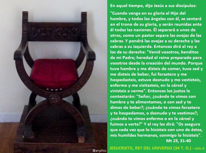 trate del final de la historia personal o del final de la historia en términos cósmicos. Lo primero que llama la atención es que no se trata de un rey que se ponga a sí mismo en el centro de la escena. Al contrario, el centro de todo va a ser la persona, de manera especial a la que está en necesidad. El juicio no versa tanto sobre lo que hemos hecho con o para Dios, sino sobre lo que hemos hecho con o para el prójimo. Éste es el criterio de discernimiento y verificación de haber sido de los seguidores de Jesús: en el atardecer de la vida nos examinarán del amor.