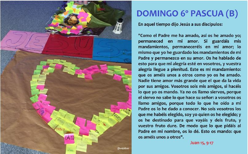 Amados por Jesús como él se sintió amado por el Padre. Amados por Jesús e invitados a permanecer en ese amor. Permanecer en su amor para poder amar como él. No de cualquier manera: en función de mis intereses, cuando me conviene, cuando estoy de buen humor o con la generosidad a flor de piel, en función de mis gustos… o a “los nuestros” o a los que me caen bien. No, Jesús no nos ha dicho que amemos de cualquier manera, sino a su estilo: “Este es mi mandamiento: que os améis los unos a los otros como yo os he amado”. Sabemos que el suyo fue un amor hasta dar la vida, pero mientras tanto fue un amor que daba vida. También la dio más allá de la muerte, que es lo que recordamos, celebramos y actualizamos en este tiempo de pascua.