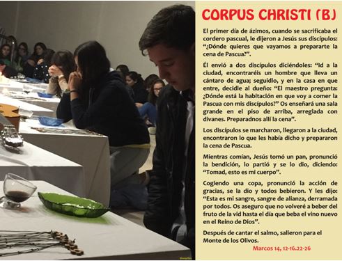 Por otro lado, la solemnidad del Corpus nos recuerda el Jueves Santo, inicio del Triduo Pascual. Es interesante el juego que hace la liturgia al proponer los pasajes evangélicos de ambos días. El jueves santo, en el contexto de la densidad de la entrega de Jesús, como signo eucarístico se nos presenta el lavatorio de los pies. Eucaristía vinculada al servicio a y de la comunidad. El Corpus, sin embargo, se nos presenta el relato de la institución de la eucaristía. Para que no se nos olvide, a modo de recordatorio, este día se suele celebrar el “Día de la Caridad”.