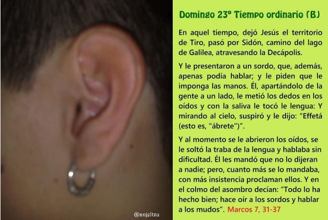 Jesús también se comprometió con el sordomudo para liberarle de lo que le oprimía: “le metió los dedos en los oídos y con la saliva le tocó la lengua”. Al hacerlo participó de la impureza de aquel hombre. La encarnación, comprometerse con lo humano, fue el estilo elegido por Dios. Dios se abrió al mundo en Jesús. Jesús se abre al mundo desde Dios: “mirando al cielo, suspiró y le dijo: effetá”.