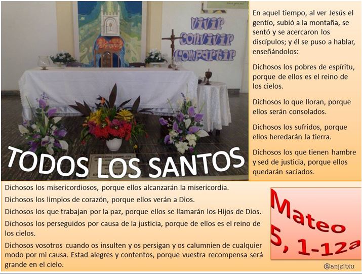 El evangelio de este día nos recuerda que la santidad es para todo hombre y para toda mujer de cualquier tiempo y cualquier lugar, porque toda persona que viene a este mundo quiere ser dichosa, feliz, bienaventurada. Así nos llama Jesús, bienaventurados, a todos los que queremos acoger su “programa de vida”.