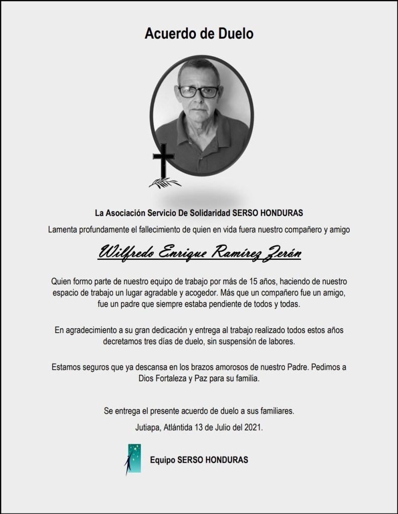 Esta noche fallecía en Jutiapa Wilfredo Ramírez, Viator Asociado, más conocido por todos como ‘Willi’. Trabajador atento de SERSO Honduras y miembro de la Comunidad Viatoriana de Honduras.