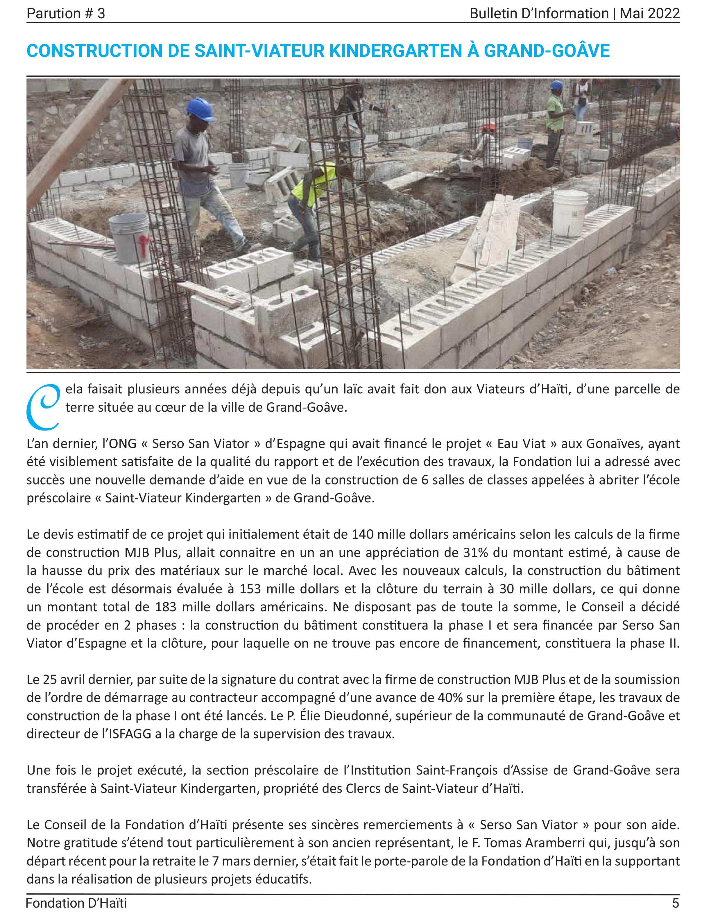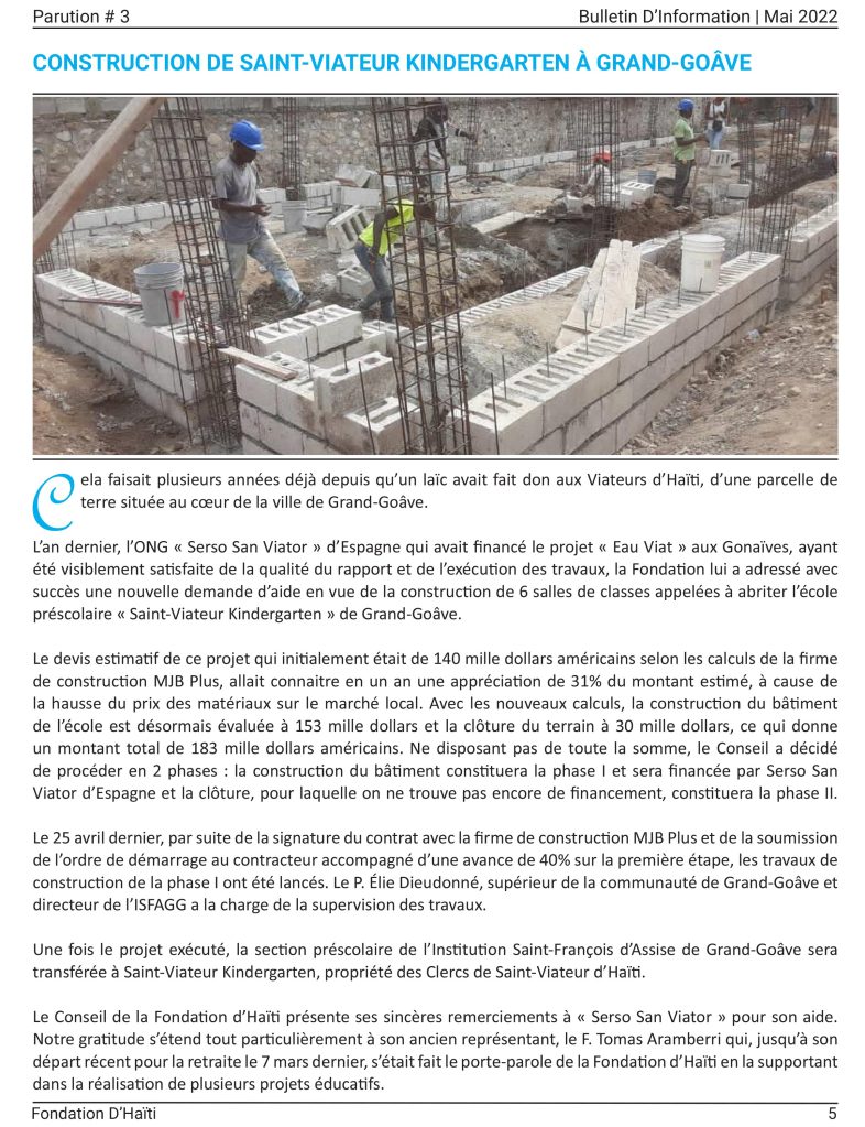 Os presentamos el Boletín de Información de la Fundación Viatoriana de Haïti. En la imagen podemos ver el comienzo de la construcción del Kinder Saint-Viateur de Grand-Goâve que financian SERSO San Viator de Euskalherria, SERSO Aragón y la Fundación Viatoriana de Solidaridad. Para comienzos de septiembre de este año corretearán por ella las y los primeros alumnos del Kinder.