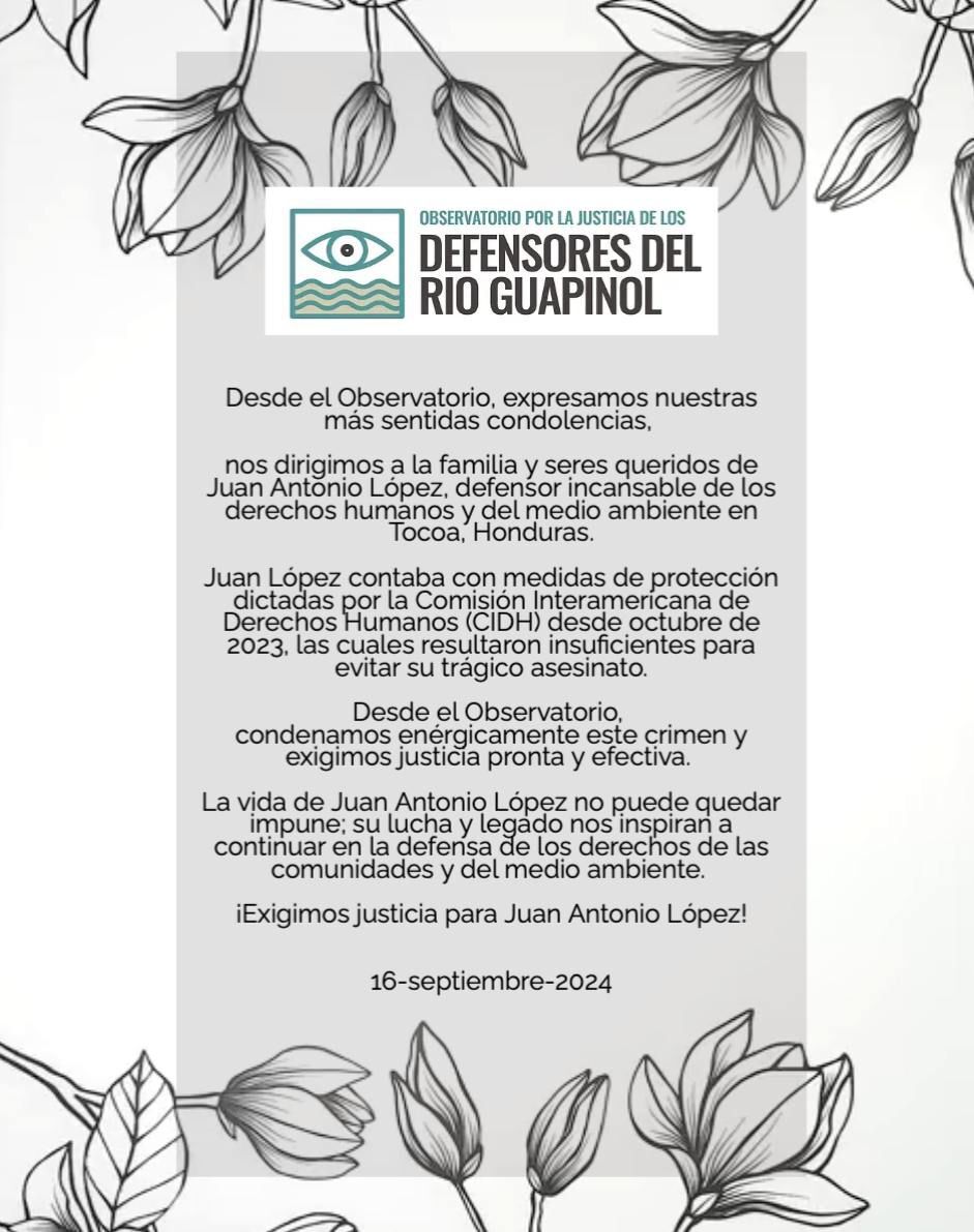 El Observatorio para la Protección de los Defensores de Derechos Humanos ha recibido con profunda preocupación la noticia del asesinato del Sr. Juan Antonio López, defensor medioambiental y coordinador del Comité Municipal de Bienes Comunes y Públicos de Tocoa (CMDBCPT). Además de tener el rol de concejal en el municipio de Tocoa, en Honduras, Juan López se destacó por su labor de defensa de los ríos Guapinol y San Pedro y del Parque Nacional Montaña de Botaderos, y por su oposición al megaproyecto extractivo de Emco Holdings/Los Pinares/Ecotek.