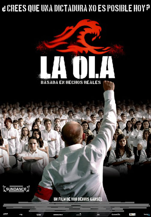 la-olaEs una película de drama alemana, basada en el experimento real la Tercera ola. El remake de 2008 tuvo un éxito satisfactorio en las grandes pantallas. Un profesor enseña realiza un experimento, para que sus alumnos se den cuenta que puede existir nuevamente un comunismo. A través de su lema: “el poder mediante la disciplina, fuerza mediante la comunidad, fuerza a través de la acción, fuerza a través del orgullo”, haciendo hincapié en ello, de tal forma que cada día los alumnos siguieran una nueva regla. Por ejemplo, el profesor logró que todos ellos entrasen a su aula y, en menos de 30 segundos, se hubieran sentado todos ellos con actitud atenta y con la espalda bien recta, resueltos a iniciar la clase. El interés por la forma extrema de inventar un saludo y a vestirse de camisa blanca.